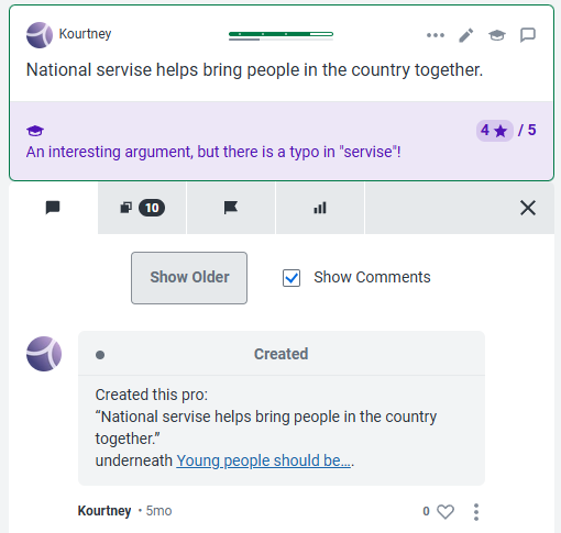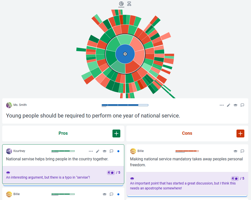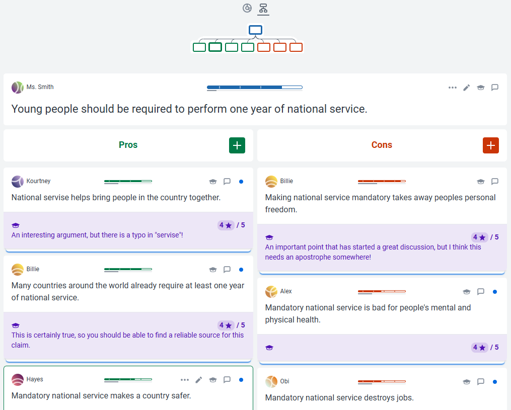 Dopo essersi registrati è possibile esplorare una discussione di esempio in inglese. Il tema è: “I giovani dovrebbero essere obbligati a svolgere un anno di servizio nazionale.” La discussione si presenta come segue:
