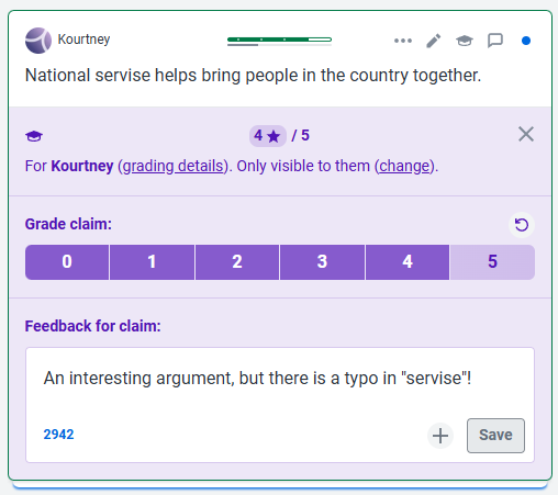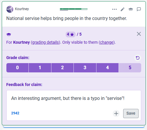 Il docente può commentare la ragione dello studente (in questo caso osservando che la ragione è interessante, ma notando un errore di battitura) e dando ad esso un voto (in questo caso 4 su 5).